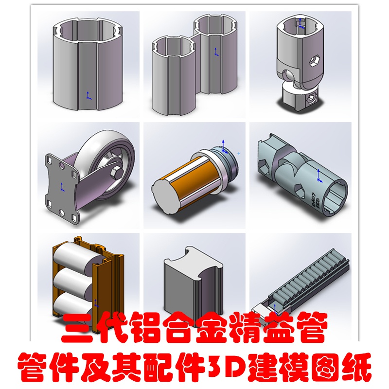 铝合金精益管三代接头管子配件辅件脚轮3D模型图设计图全套。热门设计联盟服务商
