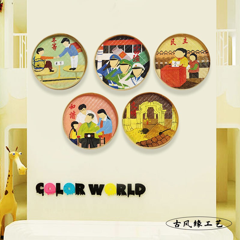 手绘簸箕画竹编挂画幼儿园装饰画社会主义核心价值观文化墙饰包邮热门设计联盟服务商