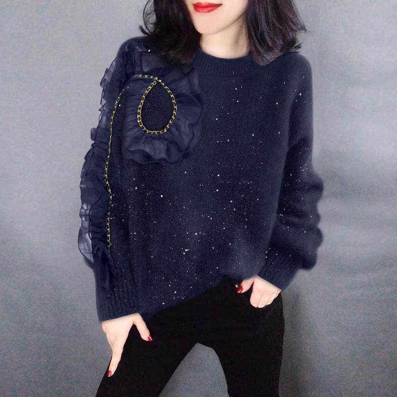 简约设计感网纱拼接套头针织衫厚毛衣欧洲站2021秋季女装新款欧货热门设计联盟服务商